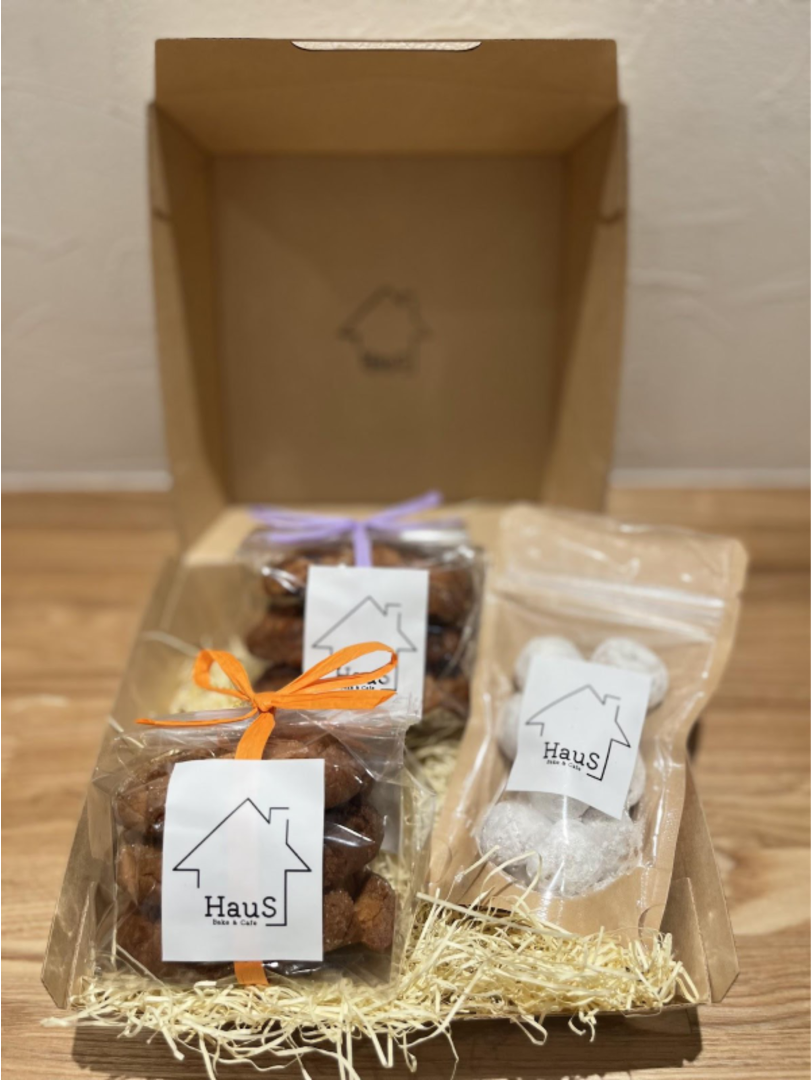 HauS人気クッキーの詰め合わせ。店頭でも人気の高いオートミールチョコチップクッキー・ピーナッツバタークッキー・ジンジャースノーボールの3品をギフト用に詰め合わせました。ちょっとしたお手土産におすすめです。